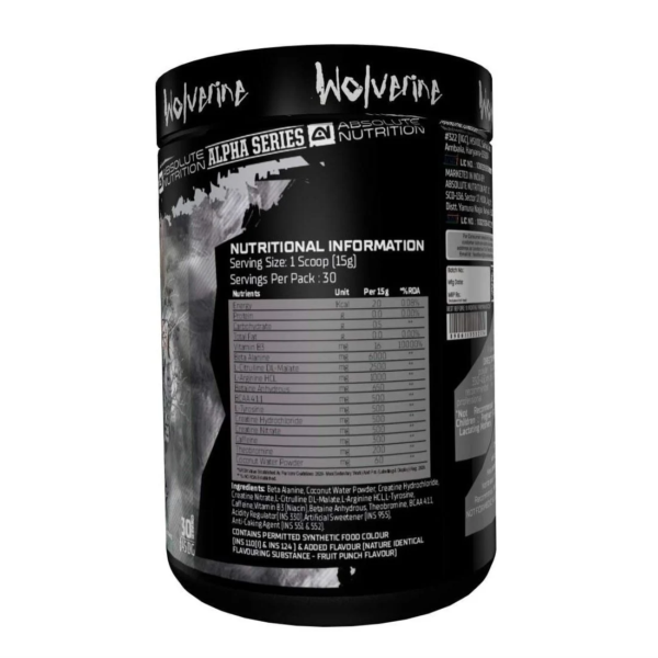 • What it does? – The ultra-premium Alpha series ‘Pre Workout’ Wolverine by Absolute Nutrition helps you conquer those explosive workouts. The fusion of Beta Alanine helps to get you through those prolonged workouts and provide you with explosive energy.