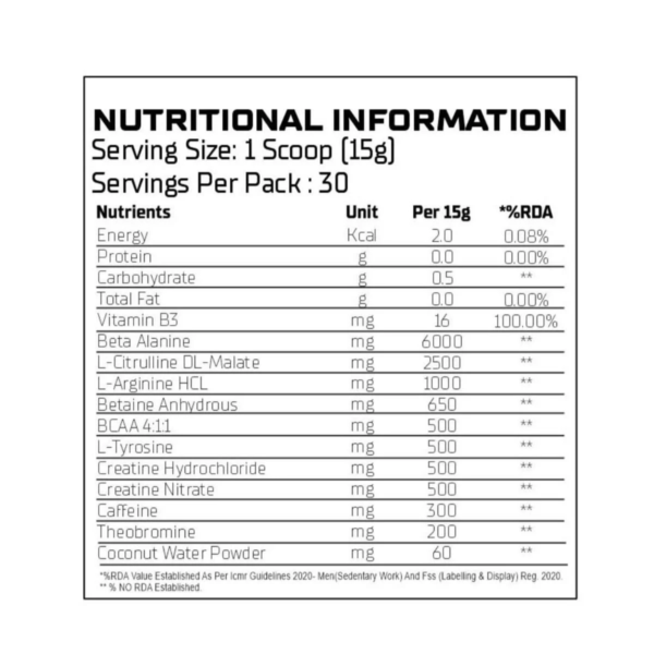 Get ready for Absolute Nutrition’s all new Pre workout ‘Wolverine’ which will help you in conquering those explosive workouts. Our premium quality pre workout sports supplement offers a massive 300MG Caffeine to give you a never ending boost of unfiltered energy. The scientific combination of 6000MG Beta Alanine with coconut water powder helps you in increasing your workout endurance and also helps in increasing muscle growth. The all new pre workout wolverine by Absolute Nutrition is fused with 2500MG L Citrulline DL Malate which helps in reducing muscle fatigue while simultaneously increasing the endurance of your workouts. The blend of 1000MG L Arginine HCL improves blood flow, promotes endurance and muscle conditioning.