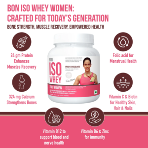 ✔Bon ISO whey women, supports muscle recovery, bone strength, menstrual health, and promotes holistic well-being. Each serving provides 24 grams of protein to enhance muscle recovery, 329 mg of calcium to strengthen bones, 81 mcg Folic acid to support menstrual health. It also contains Vitamin B12 for blood and nerve health, Vitamin C and biotin for healthy skin, hair, and nails and Vitamin B6 and zinc for immunity. Folic acid is crucial for women’s health as it promotes brain health, supports the formation and maintenance of red blood cells, and contributes to heart health. It plays a key role in reducing the risk of anemia and supports overall well-being.