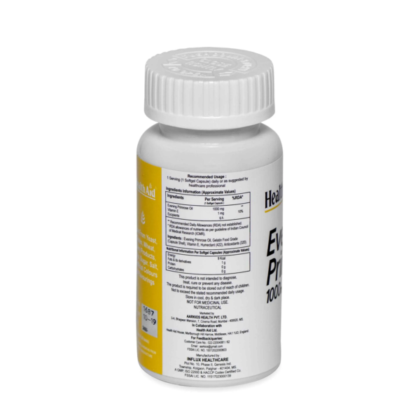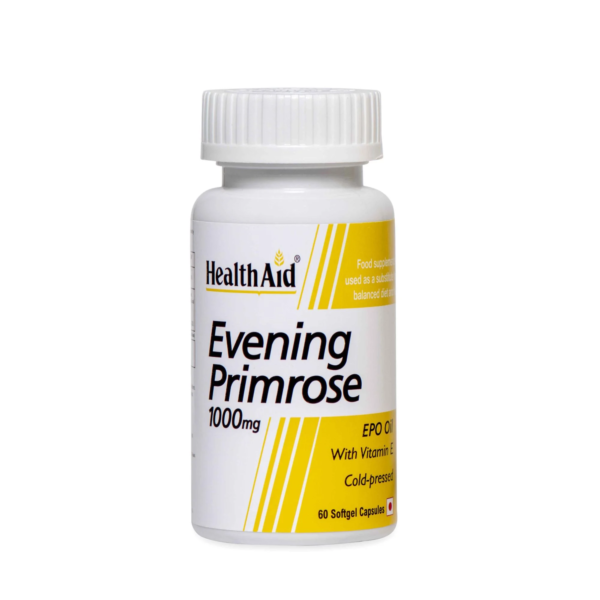 Evening Primrose Oil 1000mg Capsules contain Evening Primrose Oil (EPO), which is a rich natural source of Gamma Linolenic Acid (GLA) essential for the production of Prostaglandins to help maintain and keep the body metabolism running smoothly and efficiently. EPO from HealthAid with added Vitamin E is cold pressed and hermetically sealed in a soft capsule to maintain freshness and purity. BENEFITS: Pre-menstrual Syndrome (PMS); where it has been shown to eradicate swollen abdomen and help reduce breast discomfort, as well as reducing irritability and depression. Eczema and other skin disorders such as Psoriasis, EPO may help to restore the oils back into the skin and provide nourishment to the skin cells. Cholesterol and Blood Pressure; it has been shown to reduce high serum cholesterol and blood pressure, but may take several weeks or longer to achieve. Cases of Rheumatoid Arthritis. Alcoholism; it may make withdrawal easier, and reduce post-drinking depression. The Immune System; low levels of essential fatty acids may stop the action of interferon and the body’s natural virus killer; therefore increased GLA in the system would be beneficial. Other conditions include: Obesity, Benign Breast Disease, Childhood Hyperactivity and Schizophrenia which have all been shown to be helped by EPO supplementation. INGREDIENTS: Evening Primrose Oil, Capsule Shell [ gellaing agent (gelatine), humectant (glycerol, purified water)], Vitamin E (dl-alpha tocopherol)VEG/NON- VEGETARIAN: Non-Vegetarian