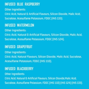 Infused Blue Raspberry, Infused Grapefruit, Infused Orange, Infused Watermelon
