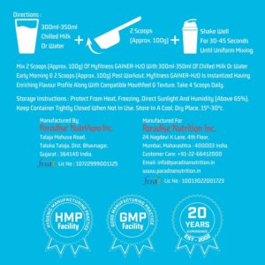 Recommended Usagemix 2 scoops (approx. 100g) of myfitness gainer-h2o with 300ml-350ml of chilled milk or water early morning & 2 scoops (approx.100g) post workout. myfitness gainer-h2o is instantized having enriching flavour profile along with compatible mouthfeel & texture. take 4 scoops daily.