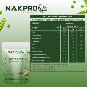 PLANT BASED PROTEIN SHAKE: Nakpro Vegan Plant Protein Powder is Plant based protein with all essential amino acids. It is a Pea protein & Brown rice protein. It is completely Natural product and perfect lactose free protein powder. 100% NATURAL AND HEALTHY: Nakpro Plant Protein gives 25.21g of Protein along with 4.85g BCAA & ultra-low in fat & almost negligible amount of carbohydrate in every scoop that helps to boost immunity, muscle health & faster recovery. SUPPORT RECOVERY POST WORKOUT: Nakpro Pea protein helps to maintain a clean diet. This plant protein shake helps in building muscle and support recovery. With a solid, well-balanced formulation and ingredients, Nakpro Plant Protein is suitable for athletes and fitness enthusiasts. NATURAL AND HEALTHY: This product is all Natural. Gluten-Free and Non- GMO, it comes with the goodness of necessary nutrients to keep you nourished. Nakpro Plant Protein is free from Dairy products and Soy, being totally allergen- free. It does not have any added sugar and fillers. DIRECTIONS OF USAGE: Mix 1 level scoop of Nakpro Plant Protein in 250-300ml water/Plant- based milk or any other beverage of your choice & use Shaker for better solubility.