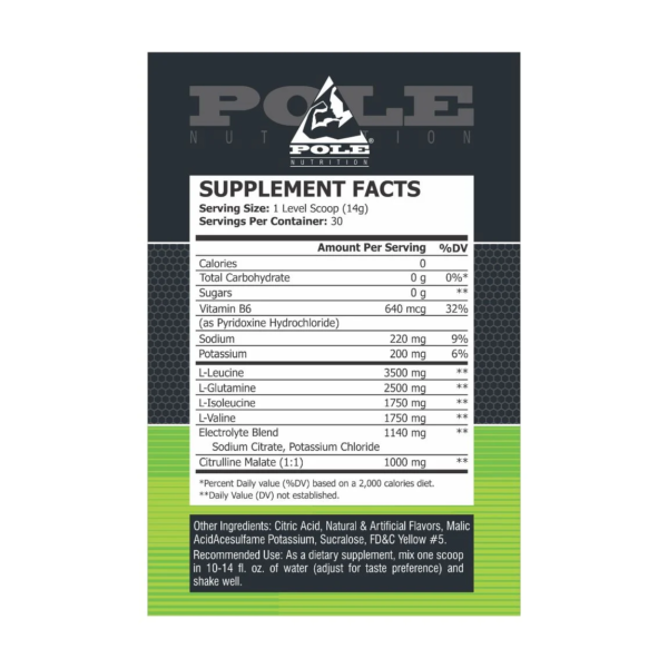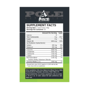 Pole Nutrition Stroke™ BCAA is  formulated to deliver maximum amounts of highly tested Branch Chain Amino Acids that will maximise your training intensity and longevity while flooding your body with a perfect blend of re-hydrating electrolytes and salts with added Citrulline for intra workout pump.
