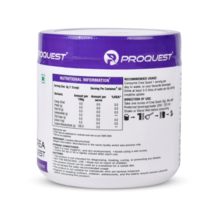 ProQuest Crea Quest (Creatine Monohydrate) offers 3 grams of fast-absorbing micronized creatine per serving, promoting rapid absorption for quicker strength and endurance gains, lean muscle growth, and enhanced recovery without the need for loading. Ideal for athletes, bodybuilders, and powerlifters, this supplement improves muscle volumization, size, and strength. The micronized creatine optimizes bioavailability for superior absorption. Suitable for everyone from active individuals to high-performance athletes, ProQuest Creatine ensures optimal workout efficiency. This high-quality, pure creatine powder contains no added flavors, banned substances, artificial colors, fillers, or sugar. Mix 3g with 200-220 ml of water or juice for enhanced workout performance.