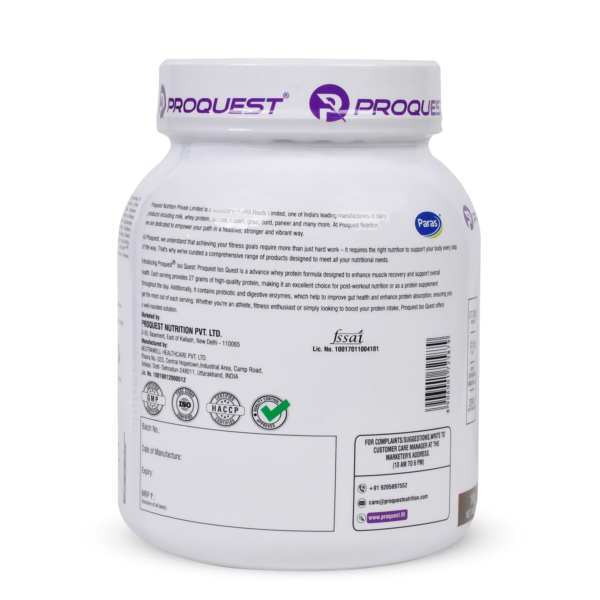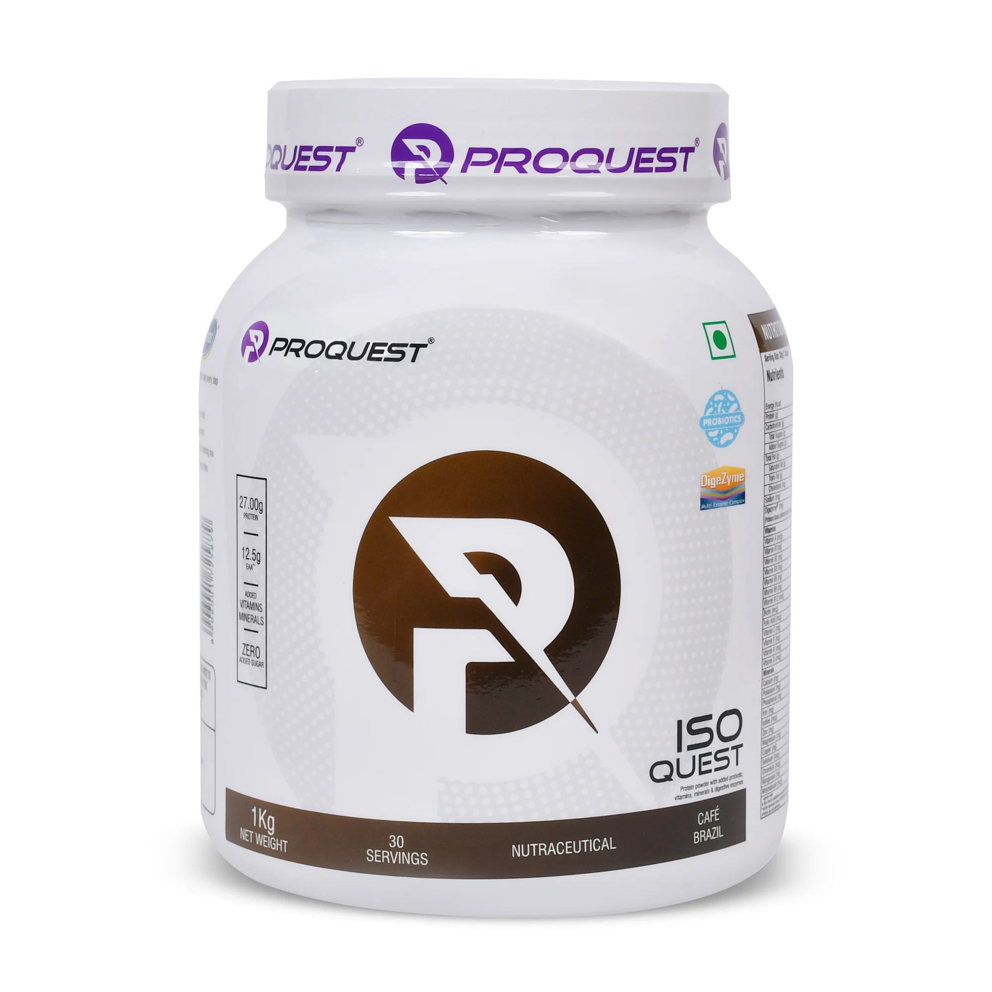 Elevate your fitness journey with Proquest Iso Quest’s Café Brazil Flavoured Isolate Whey Protein. A hefty 27g of Quality Protein, helpful for both Muscular Building and Recuperation, are included in each 33g Serving. For entire Nutritional Support, a combination of Essential Vitamins and Minerals is added. Because it contains no Added Sugar, fat, or carbs, Iso Quest supports Weight loss and a Slim body. Probiotics improve gut health and facilitate better absorption of nutrients. In addition, the DigeZyme® that is included ensures improved absorption and digestion, which makes this protein powder an excellent option for bodybuilders, athletes, and fitness enthusiasts.