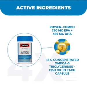 Swisse Ultiboost Odourless 4 X Strength Wild Fish Oil Concentrate is a premium quality, sustainably sourced formula containing high potency omega-3 fatty acids EPA and DHA to provide anti-inflammatory and joint health support, as well as maintaining heart, brain and eye health.